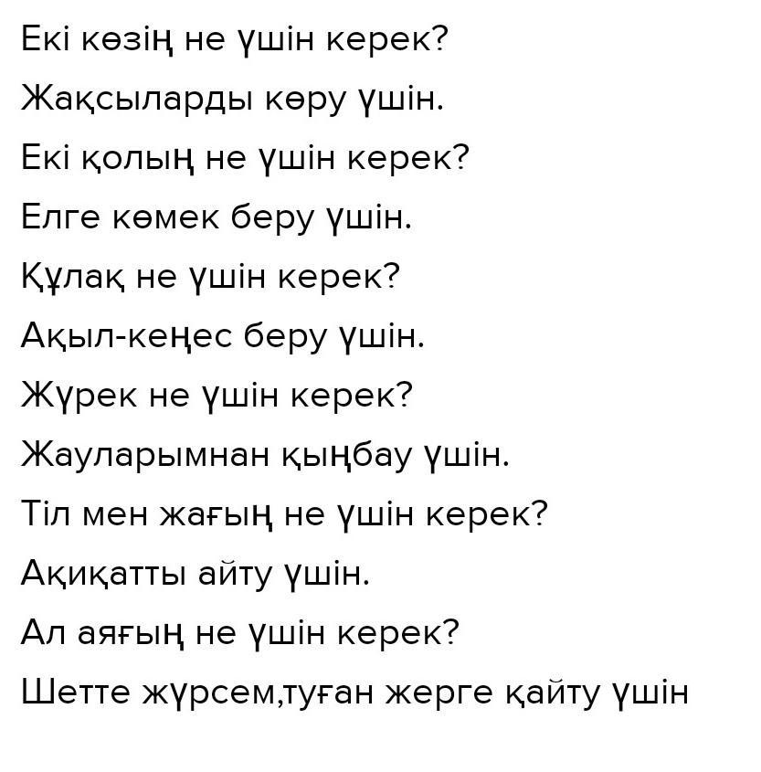 4. Көп нүктенің орнына тиісті сөздерді қойып жазыңдар. Осы үлгіде өздерің де өлең жазып көріңдер. - - Екі көзің не үшін керек? көру үшін! ... - Екі қолың не үшін керек? -Елге .. үшін! ... Кулак деген не үшін керек? тыңдау үшін! - Жүрек деген не үшін керек? ... кынбау үшін! - Тіл мен жағын не үшін керек? ... .... айту үшін! Ал аяғын?.. Шетте жүрсем, туған жерге ... үшін!