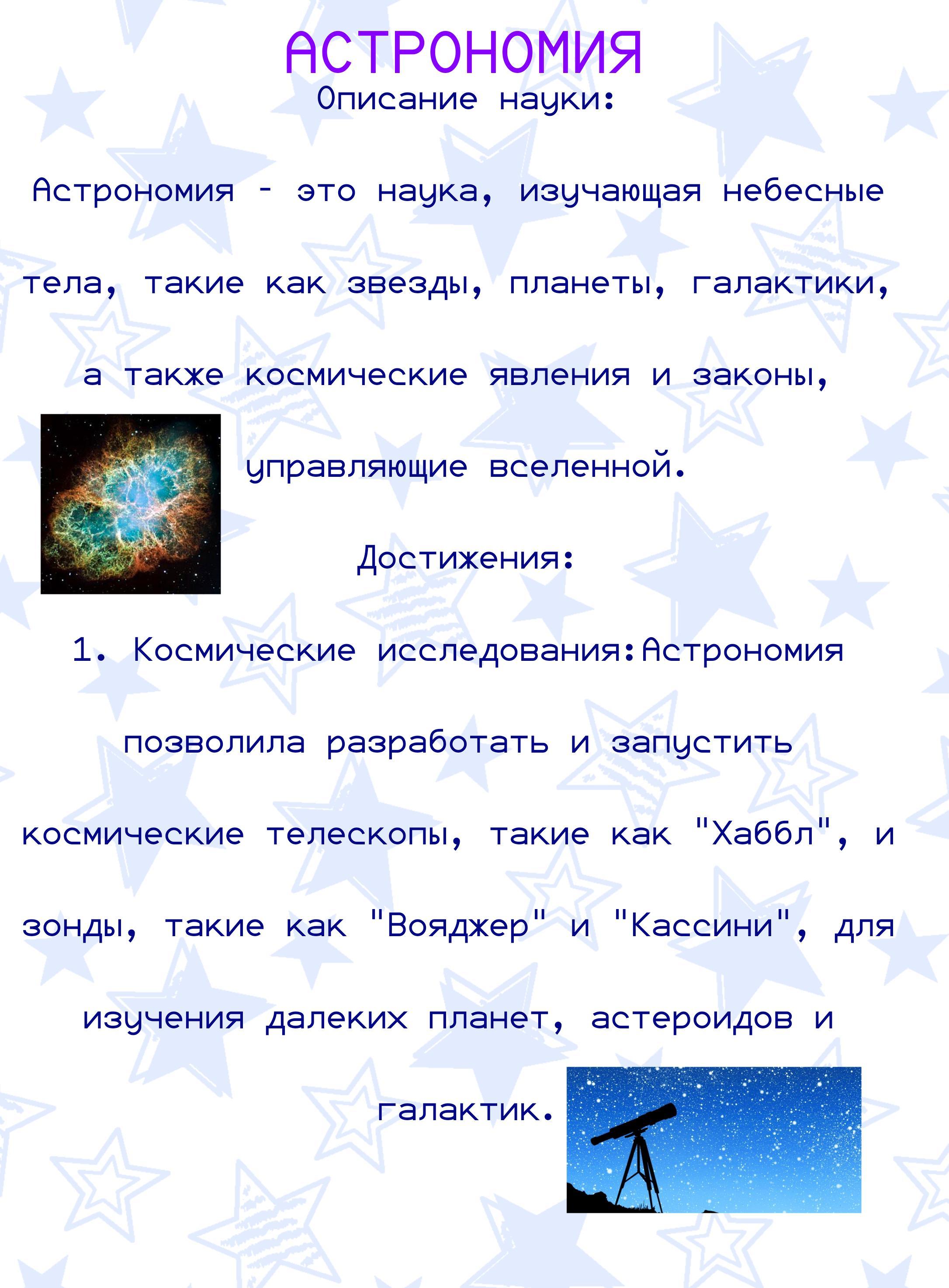 Астрономия – это наука, изучающая небесные тела, такие как звезды, планеты, галактики, а также космические явления и законы, управляющие вселенной.