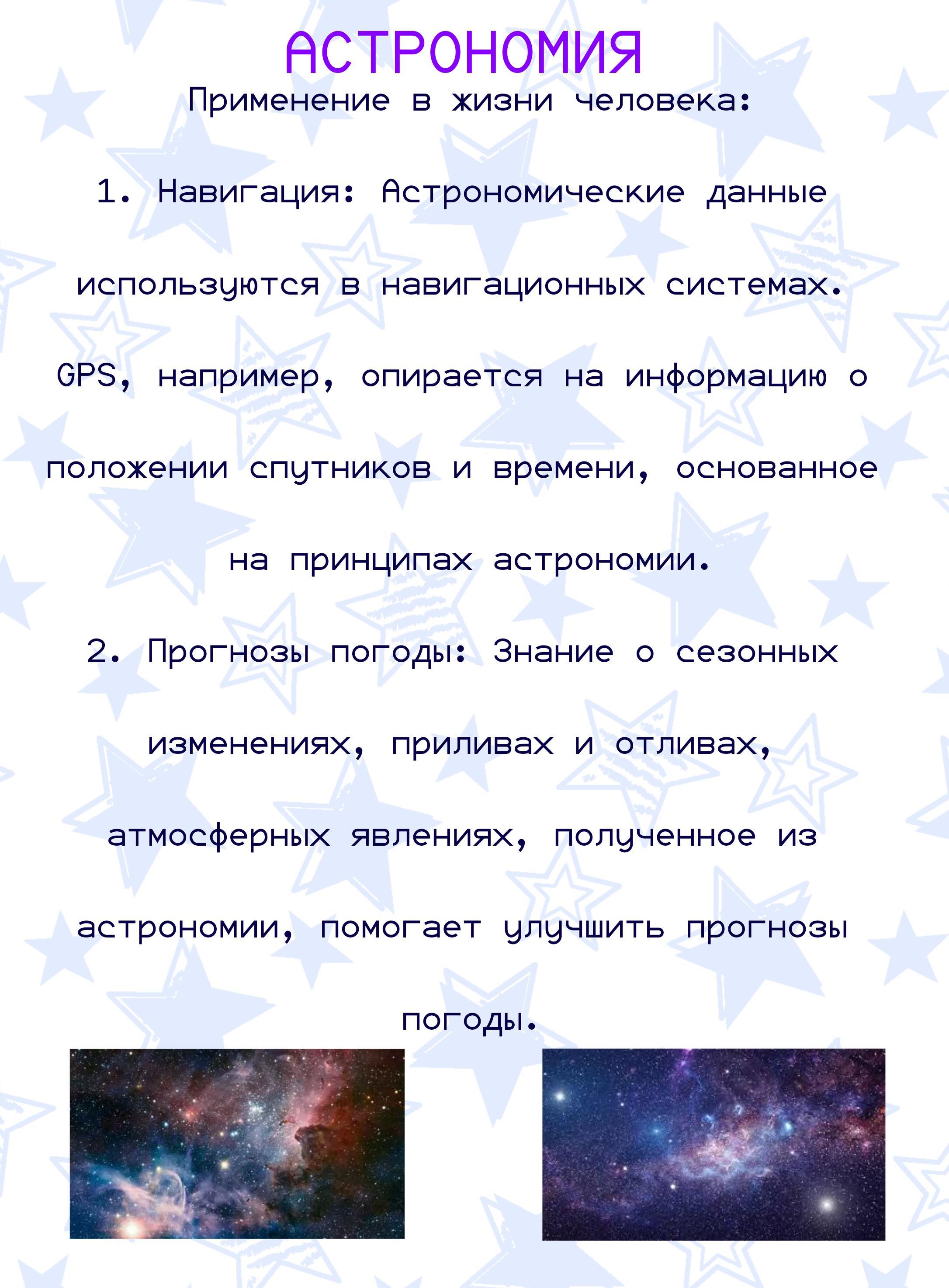 1. **Навигация:** Астрономические данные используются в навигационных системах. GPS, например, опирается на информацию о положении спутников и времени, основанное на принципах астрономии.