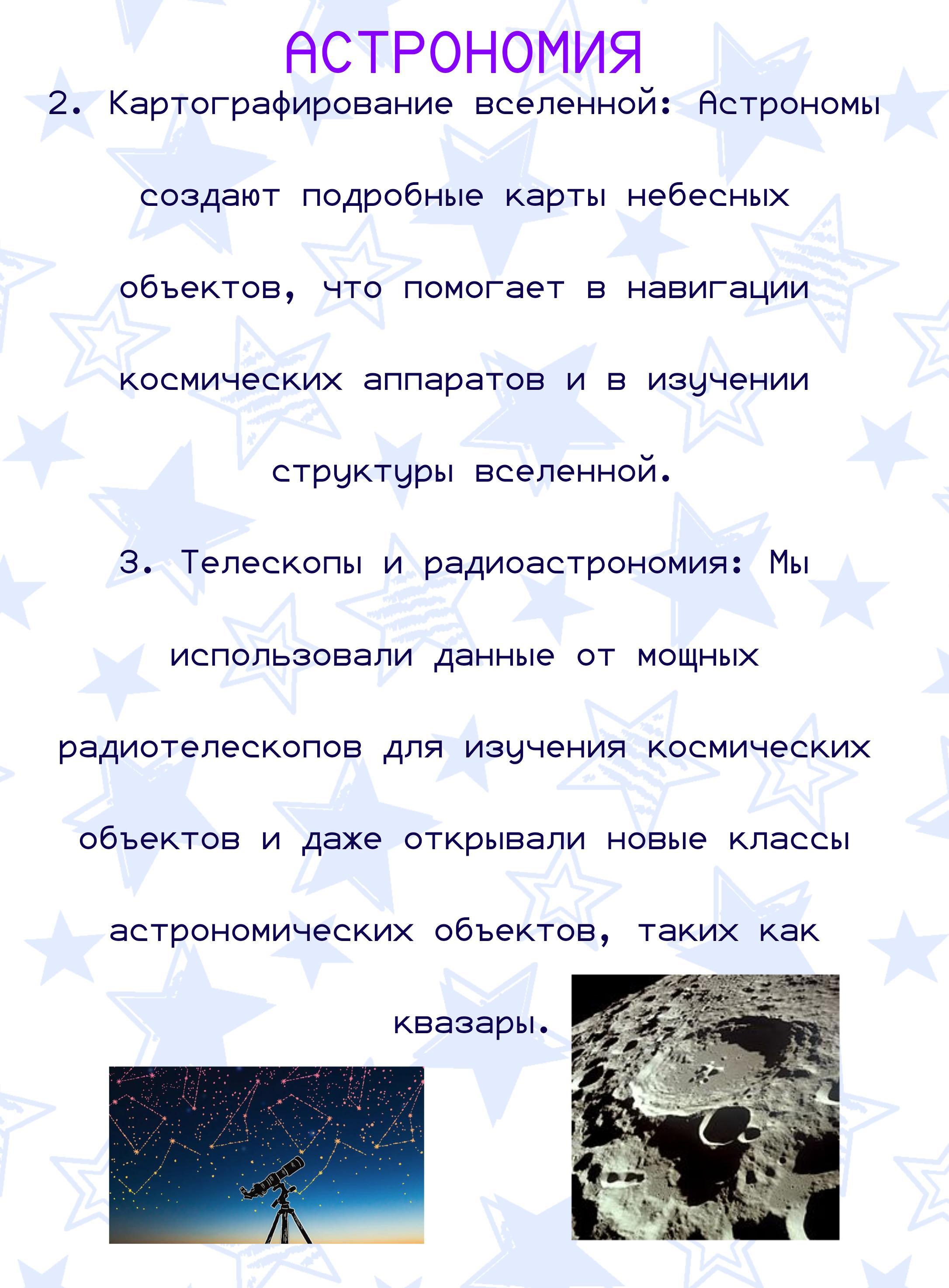3. **Телескопы и радиоастрономия:** Мы использовали данные от мощных радиотелескопов для изучения космических объектов и даже открывали новые классы астрономических объектов, таких как квазары.