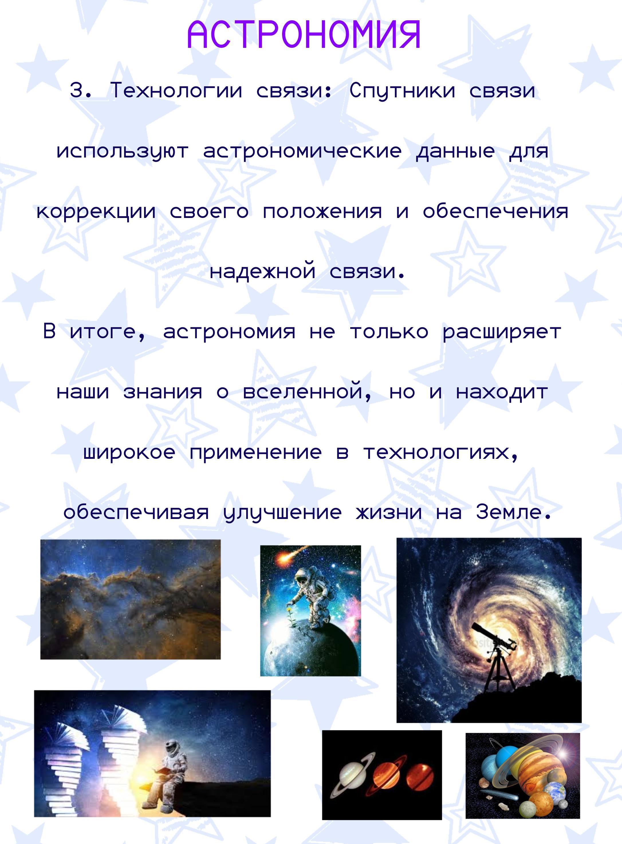 В итоге, астрономия не только расширяет наши знания о вселенной, но и находит широкое применение в технологиях, обеспечивая улучшение жизни на Земле.