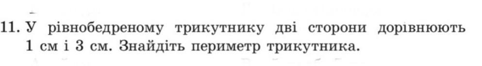 11. У рівнобедреному трикутнику дві сторони дорівнюють 1 см і 3 см. Знайдіть периметр трикутника.