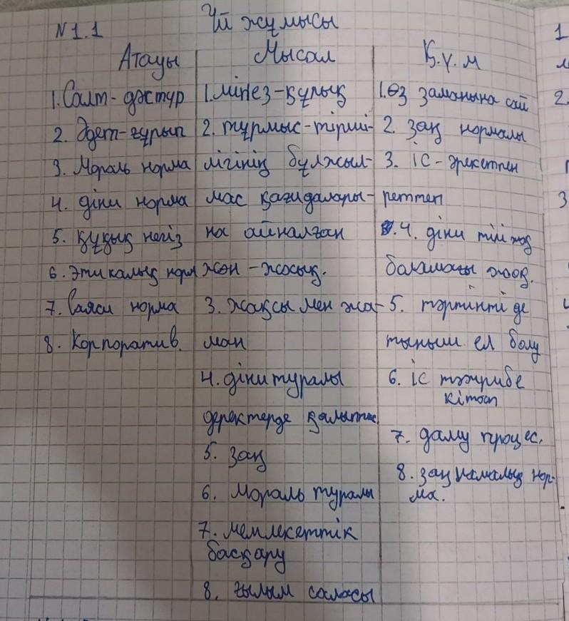 Nº 10 лiкке қарсы болуы мүмкін бе? 1-деңгейлі тапсырма. 1-кестені толтырыңдар. Атауы 1 Салт-дәстүр 2 Әдет-ғұрып 3 Мораль нормалары 4 Құқық нормалары 5 Дiни нормалар 6 Этикалық нормалар 7 Саяси нормалар 8 Корпоративтік нормалар Әлеуметтік нормалар Мысалдар Қоғам ушiн маңыздылығы 1-кесте