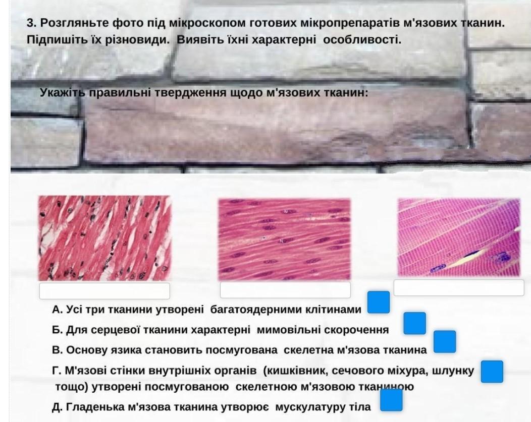 1) гладка м'язова тканина-мимоволі скорочується, утворюють мускулатуру тіла, скорочення стінок шлунка і кишечника, 2) поперечноволосата серцево м'язова тканина-становить основу мови, 3) поперечно скелетно м'язова тканина-багатоядерна