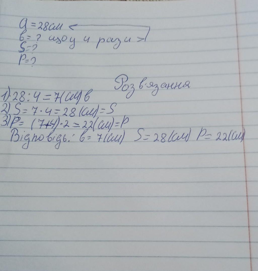 1018. Довжина прямокутника дорівнює 28 см, що у чотири рази біль- ше за ширину. Знайди периметр і площу цього прямокутника