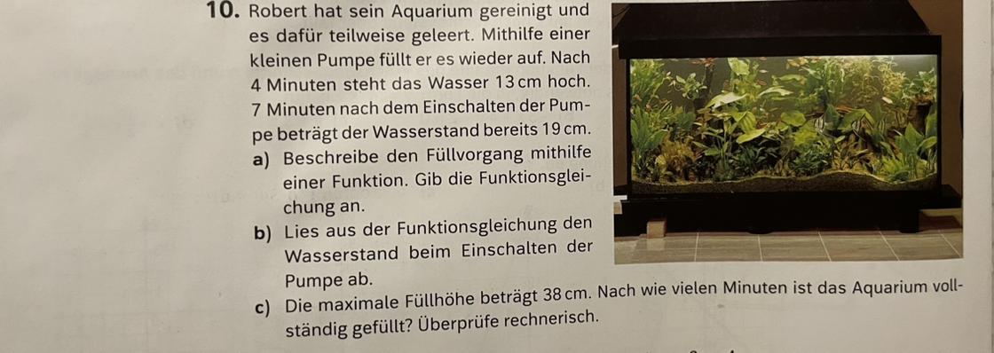 Роберт почистил свой аквариум и частично его опорожнил. Он снова наполняет его с помощью небольшого насоса. Через 4 минуты высота воды поднимется на 13 см. Через 7 минут после включения насоса уровень воды уже 19 см.