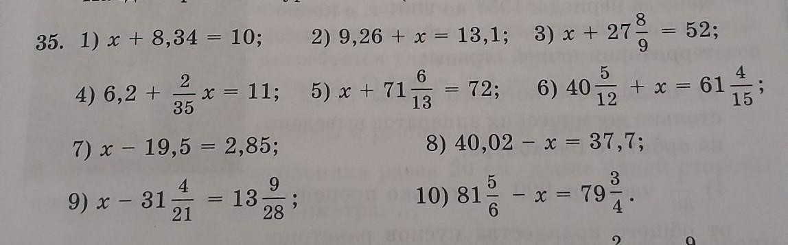 Найдите решения уравнений (35-36): 2) 9,26 + x = 13,1; 35. 1) x+8,34 = 10; 4) 6,2 + 2 6 x = 11; 5) x + 71 - 72; 35 13 7) x 19,5 = 2,85; 121 9) x - 31 13 9 28 3) x + 27 ²/ x + 27² = 52; 10) 81 6) 402 + 8) 40,02 - x = 37,7; 315 x = 79 %/1. 6 - 6115 пж