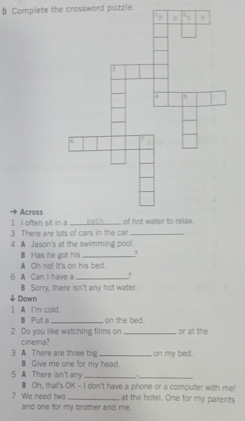 b Complete the crossword puzzle. 6 3 Oh no! It's on his bed. Can I have a Sorry, there isn't any hot water. Across 1 I often sit in a bath of hot water to relax. 3 There are lots of cars in the car 4 A Jason's at the swimming pool. ? B Has he got his A 6 A B ↓Down 1 A I'm cold. B Put a 2 Do you like watching films on. cinema? on the bed. 4 3 A There are three big. B 5 A B 7 We need two and one for my brother and me. a . or at the on my bed. Give me one for my head. There isn't any Oh, that's OK - I don't have a phone or a computer with me! at the hotel. One for my parents