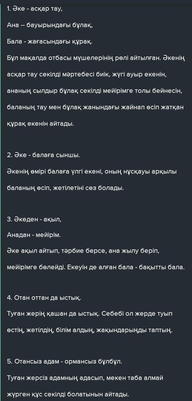 со 8 АЙТЫЛЫМ 3-тапсырма. Макал-мәтелдердің мағыналарын тусіндір. Дерексіз зат есімдерді таn. 1. Әке - асқар тау, Ана - бауырындагы булак. Бала - жағасындағы курак. 2.Әке - балага сыншы. 3. Әкеден - акыл, Анадан - мейірім. 4. Отан оттан да ыстык. 5. Отансыз адам ормансыз булбул . перевод на рускии