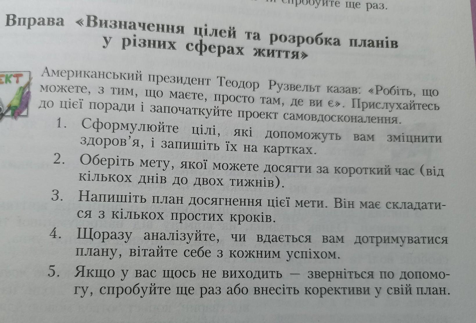 Американський президент Теодор Рузвельт казав: «Робіть, що можете, з тим, що маєте, просто там, де ви є». Прислухайтесь до цієї поради і започаткуйте проект самовдосконалення. 1. Сформулюйте цілі, які допоможуть вам зміцнити здоров'я, і запишіть їх на картках. 2. Оберіть мету, якої можете досягти за короткий час (від кількох днів до двох тижнів). 3. Напишіть план досягнення цієї мети. Він має складати- ся з кількох простих кроків. 4. Щоразу аналізуйте, чи вдається вам дотримуватися плану, вітайте себе з кожним успіхом. 5. Якщо у вас щось не виходить зверніться по допомо- гу, спробуйте ще раз або внесіть корективи у свій план.