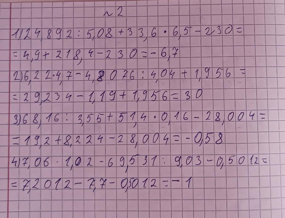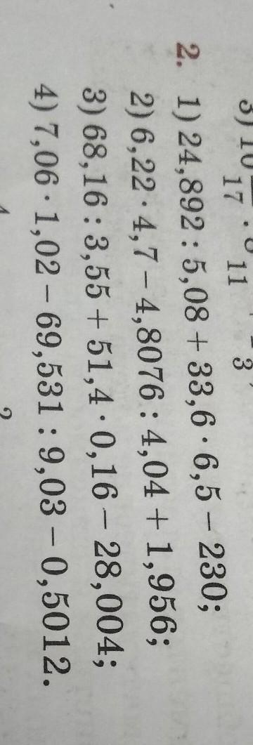 17 11 2. 1) 24,892: 5,08 +33,6 6,5-230; 2) 6,22 4,7-4,8076: 4,04 + 1,956; 3) 68,16:3,55+51,4 0,16-28,004; 4) 7,06 1,02-69,531: 9,03-0,5012. помогите