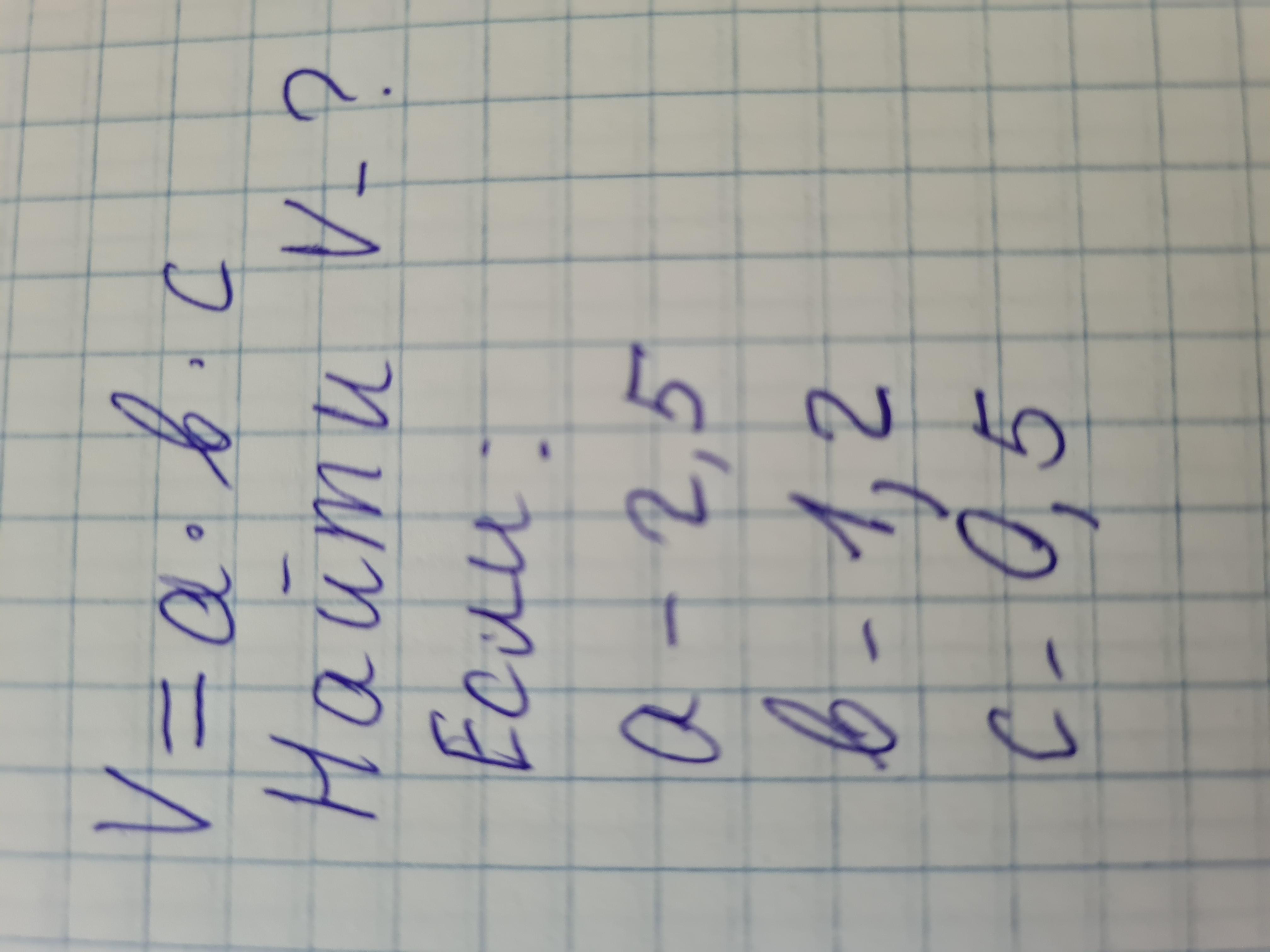 Следовательно, чтобы найти нам V, мы воспользуемся формулой V= a*b*c, Значит: V= 2,5*1,2*0,5= 1,5.