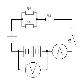 Накресліть схему до складу якої входять: акумулятор, ключ, два резистори, амперметр, вольтметр, нагрівальний елемент. Два споживача з'єднайте паралельно