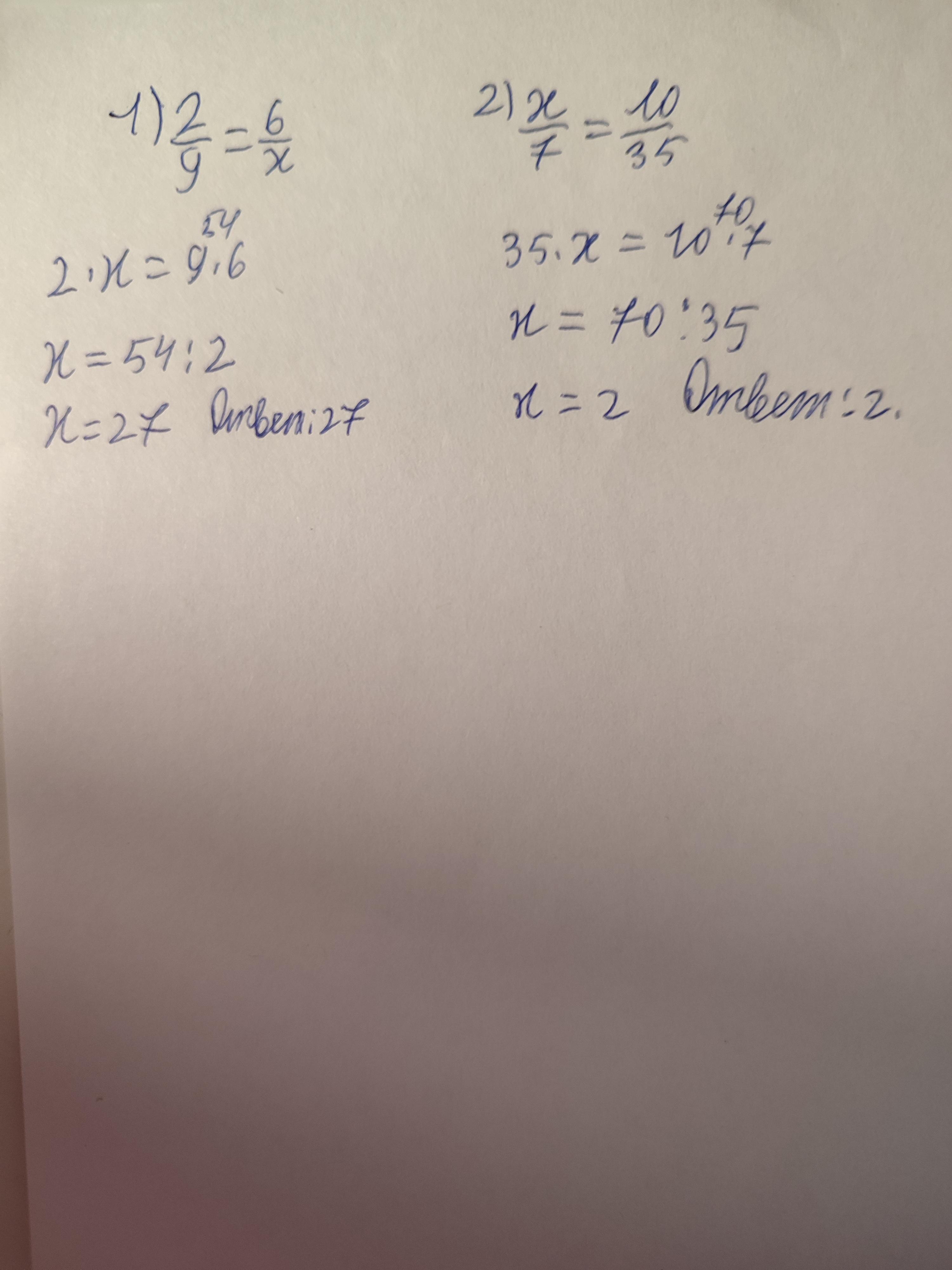 напишите в равенстве вместо х такое число чтобы полученная дробь была равна данной дроби 1)2/9=6/х 2)х/7=10/35 вы просто напишите решения,пожалуйста,а остальное я сам