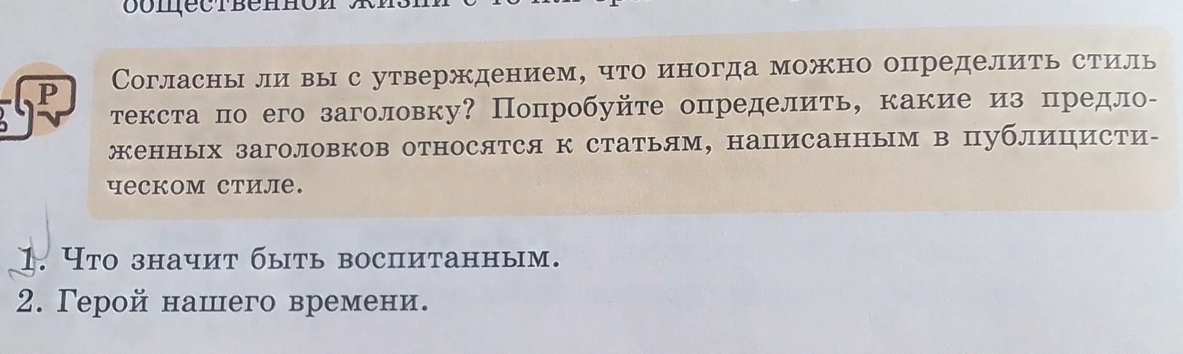 Да, иногда можно определить стиль текста по его заголовку. Из предложенных заголовков, "Что значит быть воспитанным" относится к публицистическому стилю, так как он обозначает тему общественного интереса и предполагает анализ и рассуждение на данную тему. "Герой нашего времени" также может быть отнесен к публицистическому стилю, так как он предполагает обсуждение и анализ героя современности и его роли в обществе.
