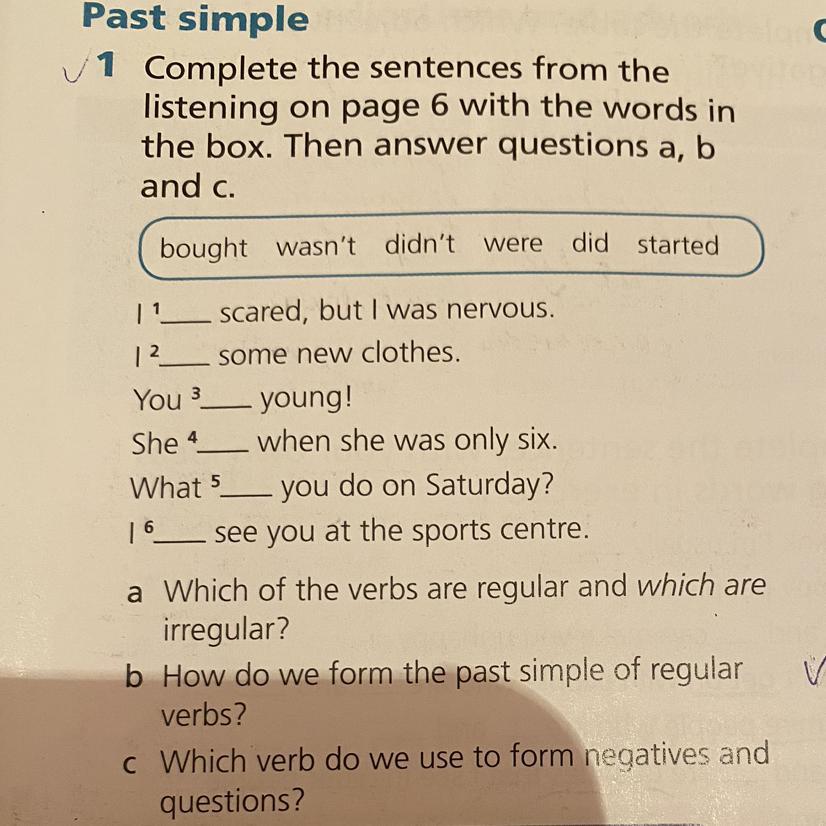 а) regular: started. irregular: bought, did, didn't, were, wasn't