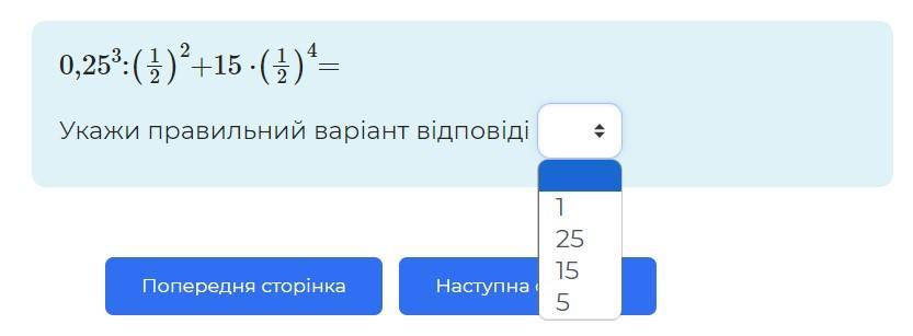 Ответ: 0,25^3 / (1/2)^2 + 15 * (1/2)^4 = 1