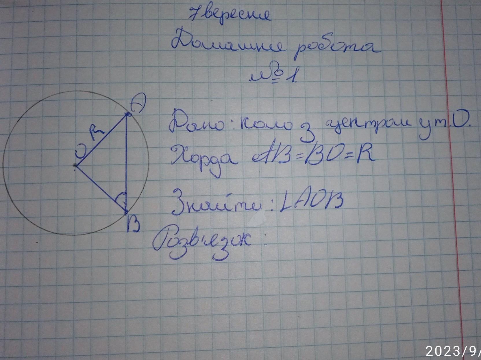 Якщо хорда АВ дорівнює радіусу R (AB = BO = R), то це означає, що АОВ є прямим кутом (90 градусів або π/2 радіанів), оскільки хорда, що дорівнює радіусу, завжди буде перпендикулярною до діаметра, і тим самим утворює прямий кут з центром кола.