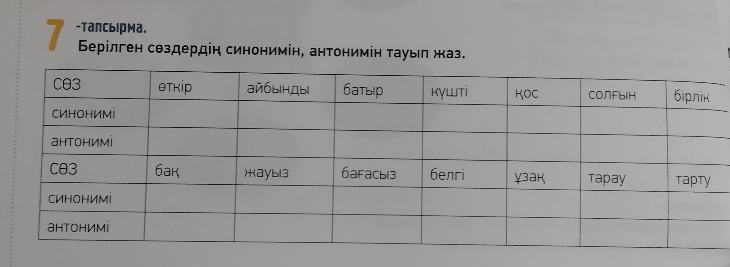 ЖАЗЫЛЫМ 7 -тапсырма. Берiлген сездердiн синонимін, антонимін тауып жаз. айбынды батыр кушт сез олоним антоними сез синоним антоним еткiр бак жауыз бағасыз белг КОС ұзақ СОЛРЫН Tapay бірлік тарту, помогите кому не сложно
