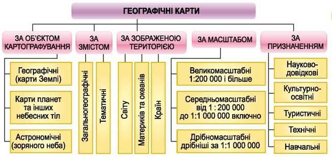 1)за об’єктом картографування розділяють карти на географічні карти (карти Землі), карти планет та інших небесних тіл й астрономічні карти (зоряного неба) ;