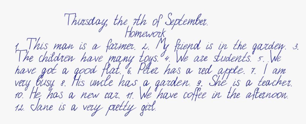 2. Напишіть в зошит речення, вставте "am, is, are, have( has)got. Фото виконаної роботи надішліть на перевірку. Thursday, the 7th of September. Homework 1. This man .... a farmer. 2. My friend..... in the garden. 3. The children ..... many toys. 4. We ...... students. 5. We ...... a good flat. 6. Peter ... a red apple. 7.1..... very busy. 8. His uncle .... a garden. 9. She .... a teacher. 10. He a new car. 11. We..... coffee in the afternoon. 12. Jane..... a very pretty girl. .....
