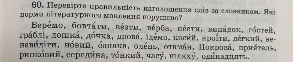 Беремо́, бо́втати, везти́, верба́, нести́, ви́падок, го́стей, граблі́, до́шка, дочка́, дро́ва, ідемо́, ко́сий, кро́їти, легки́й, не- нави́діти, нови́й, озна́ка, о́лень, ота́ман, Покро́ва, при́ятель, ри́нковий, сере́дина, тонки́й, ча́су, шля́ху, одина́дцять.