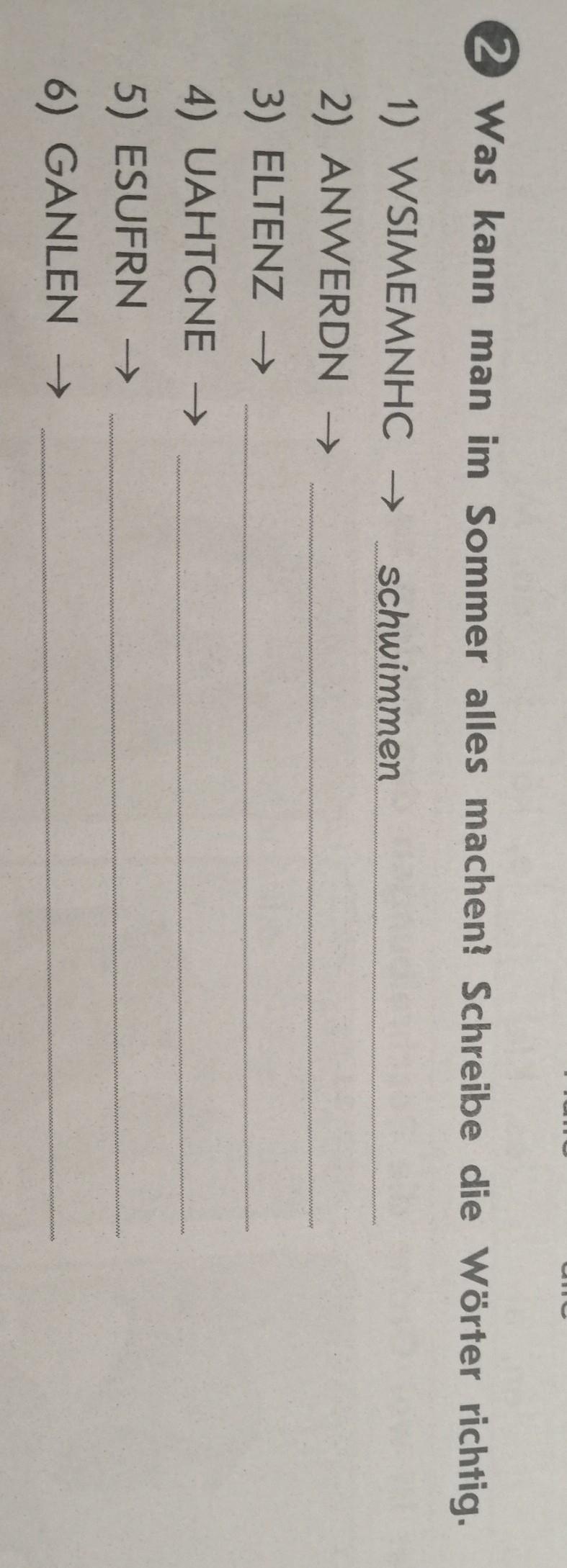 alle 2 Was kann man im Sommer alles machen? Schreibe die Wörter richtig. 1) WSIMEMNHC → schwimmen 2) ANWERDN → 3) ELTENZ → 4) UAHTCNE →> 5) ESUFRN → 6. ) GANLEN →