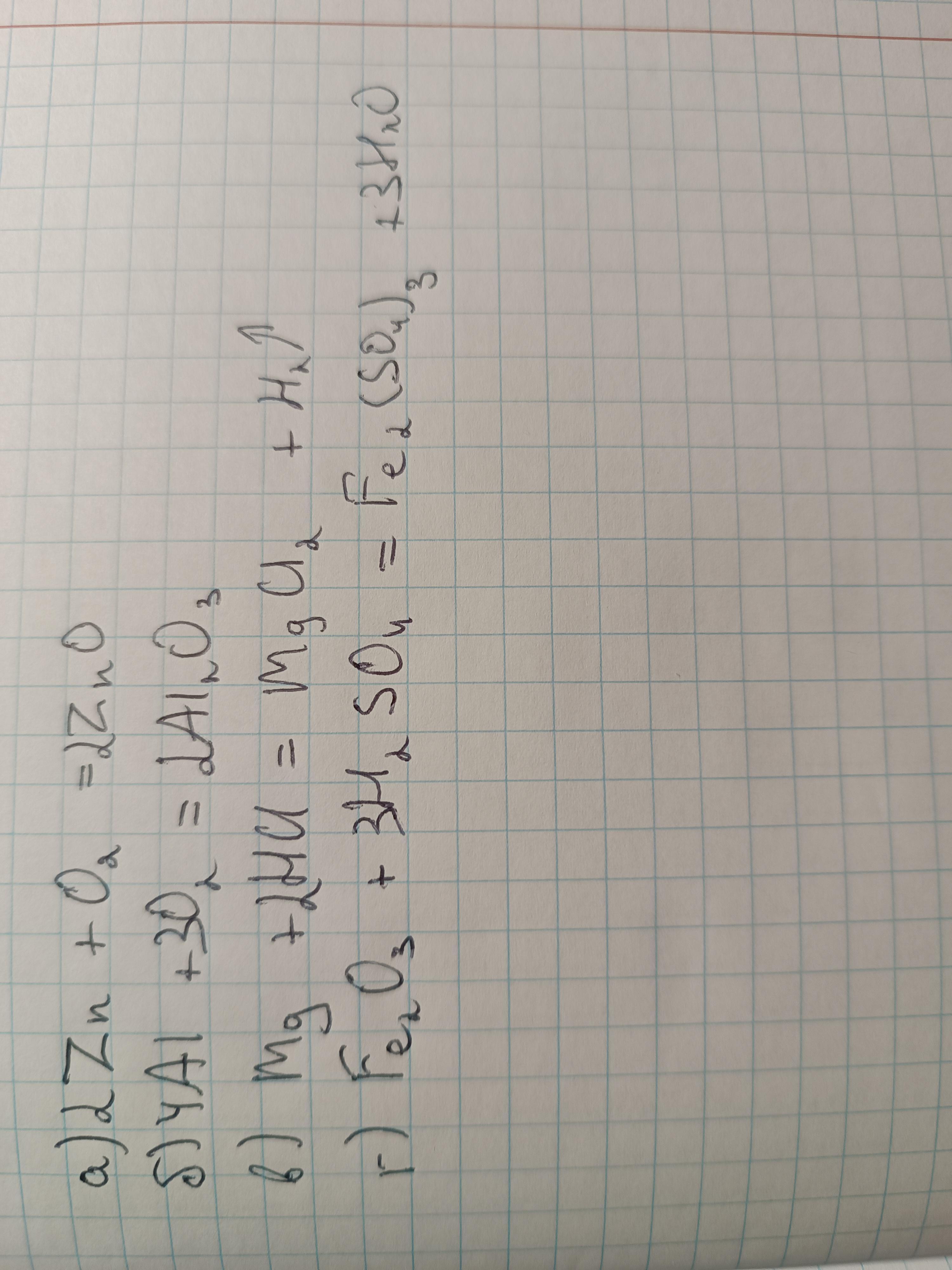 У рівняннях реакцій пропущенні коефіцієнти. Заповніть пропуски. а)…Zn+O2 =…Zn. O б)…Al+O2 = Al2 О3 в) Mg+HCI= Mg. Cl2+H2 г) Fe2 O3 + …H2 SO4= Fe2(SO4)3+…H2 O