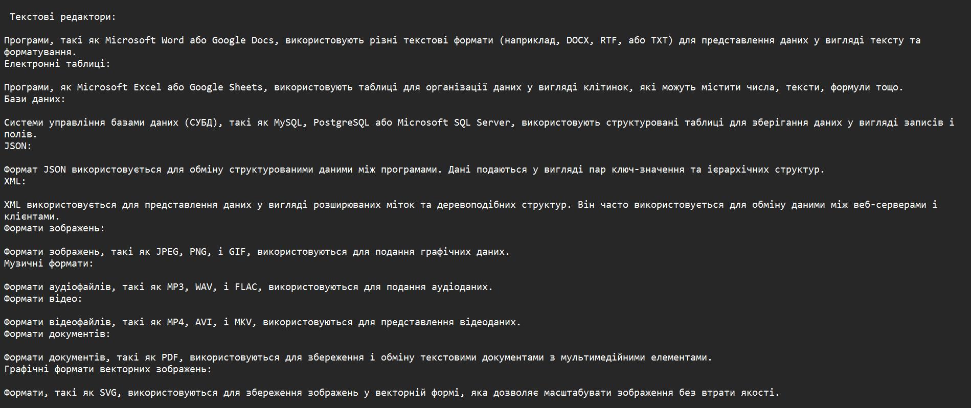 "Модель подання даних" (Data Presentation Model) це термін, який може використовуватися для пояснення того, як дані представлені або відображені в контексті конкретної ситуації або задачі. Такі програми можуть включати в себе широкий спектр інструментів і технологій для візуалізації та аналізу даних. Ось декілька прикладів програм, які можуть бути використані для різних аспектів моделі подання даних: