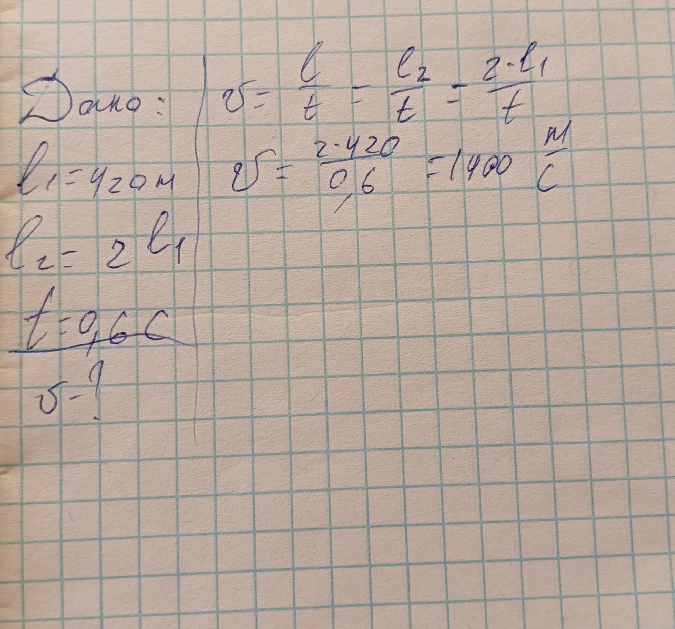 Какова скорость распространения звука в морской воде, если сигнал подаваемый батискафу, распложенному на глубине 420 м возвратился через 0,6 с