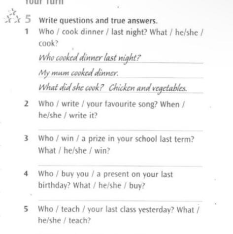 2. Who wrote your favourite song? My favourite singer wrote that song. When did he write it? He wrote it 5 years ago.