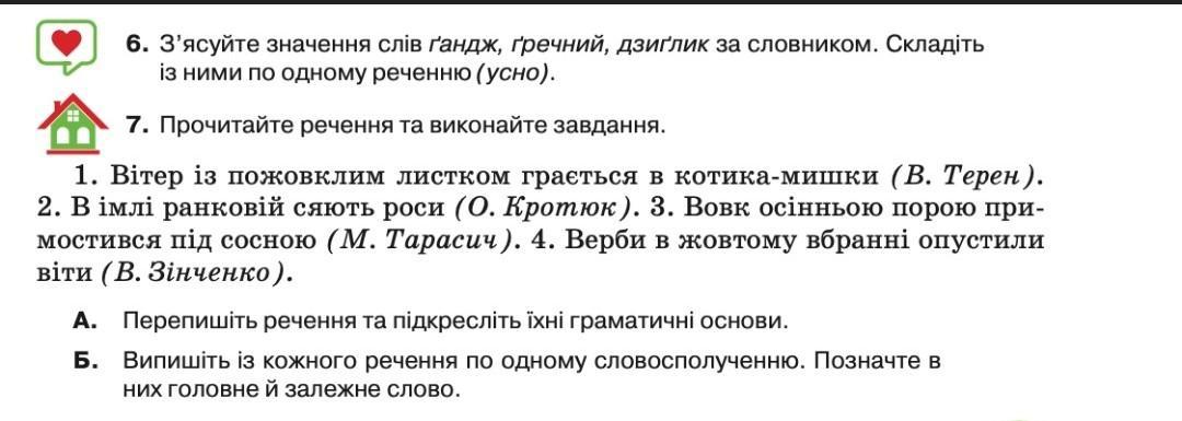 7. Прочитайте речення та виконайте завдання. 1. Вітер із пожовклим листком грається в котика-мишки (В. Терен). 2. В імлі ранковій сяють роси (О. Кротюк). 3. Вовк осінньою порою при- мостився під сосною (М. Тарасич). 4. Верби в жовтому вбранні опустили віти (В. Зінченко). А.