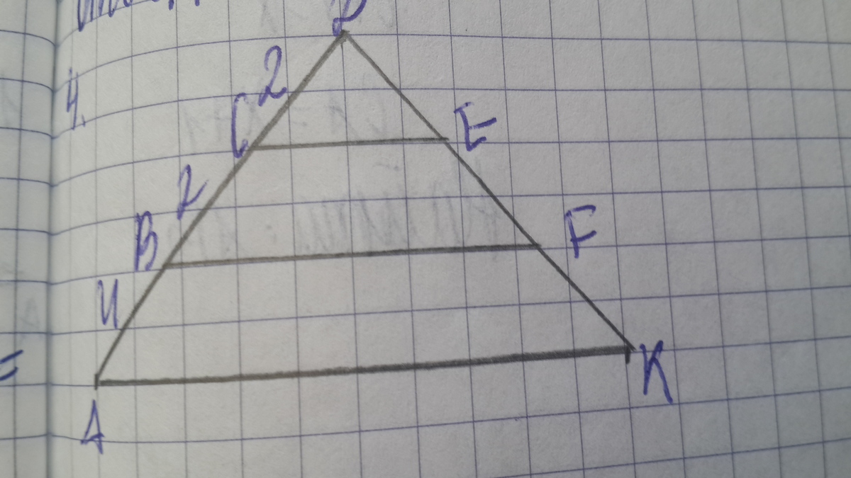 Мы видим, что АВ = 4 также. Таким образом, В - середина стороны AD. Т.к. BF по условию параллельна стороне АК, получаем, что BF - средняя линия треугольника. Зная, что средняя линия треугольника параллельна одной из его сторон и равна половине этой стороны, делаем вывод, что: