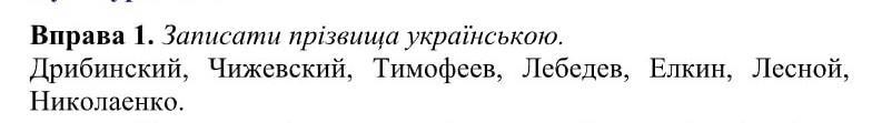 Вправа 1. Записати прізвища українською. Дрибинский, Чижевский, Тимофеев, Лебедев, Елкин, Лесной, Николаенко.