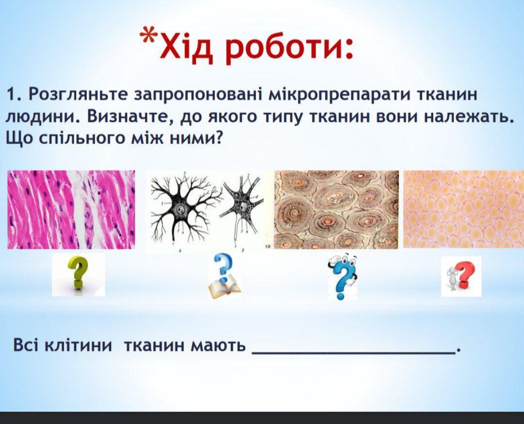 3)Походження з ембріональних шарів: Вони всі виникають з різних ембріональних шарів в розвитку організму. Наприклад, епітеліальна тканина розвивається з ектодерми, нервова тканина - також з ектодерми, кісткова тканина формується з мезодерми, а жирова тканина може бути походженням з мезодерми або інших шарів.