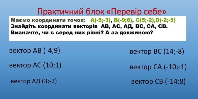 Маємо координати точок: A(-5;-3), B(-9;-6), C(5;-2), D(-2;-5) Знайдыть координати векторы AB, AC, AD, BC, CA, CB. Визначте, чи я серед них рівні? А за довжиною?