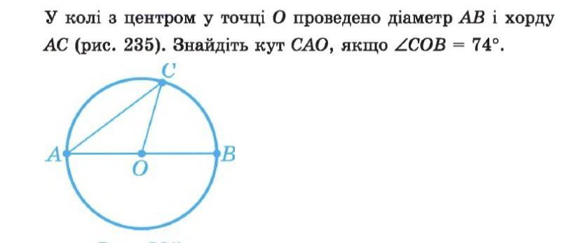 У колі з центром у точці О проведено діаметр AB і хорду AC Знайдіть кут САО, якщо Кут COB= 74°. помогите пожалуйста!!