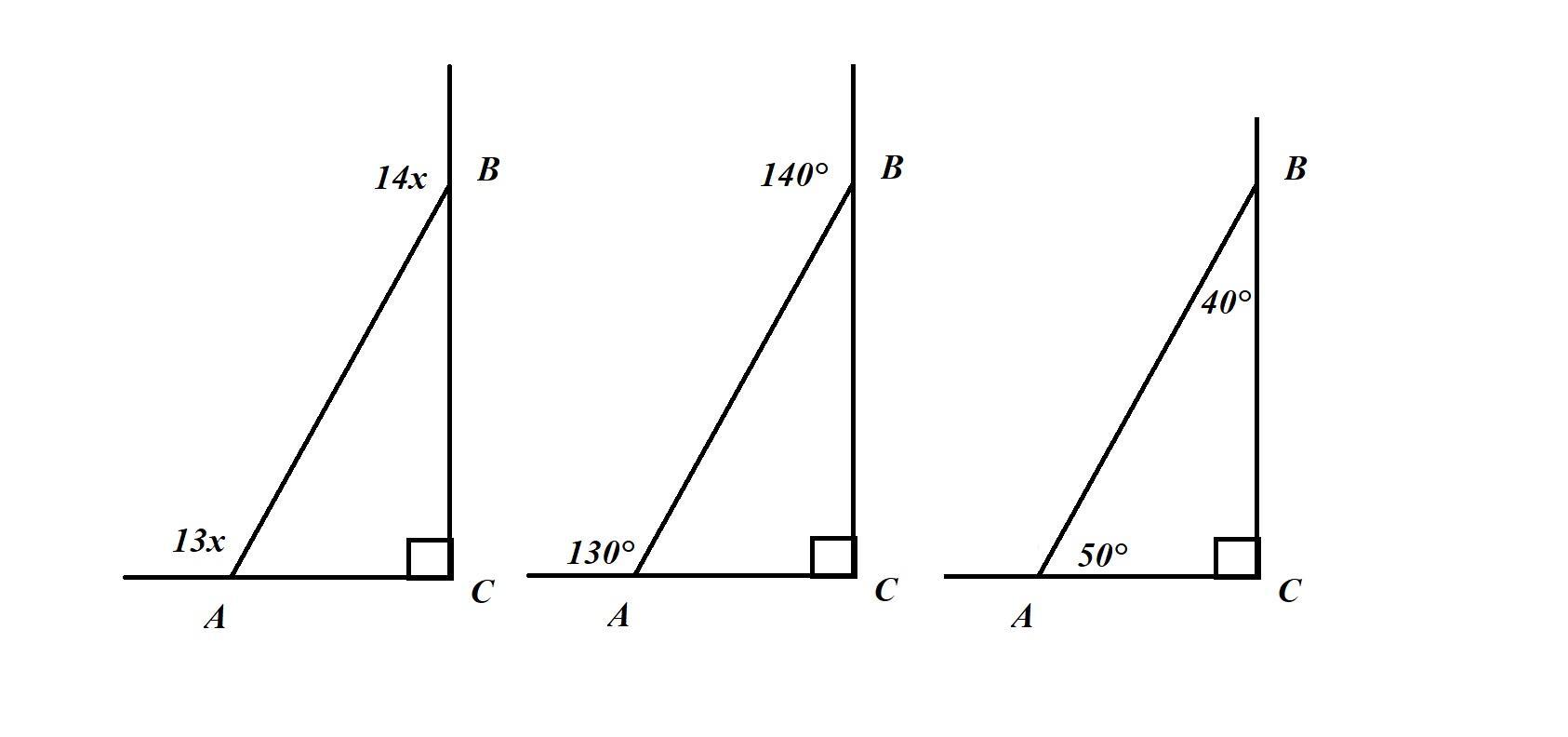 Допоможіть. Знайдіть гострі кути прямокутного трикутника , якщо зовнішні кути при вершинах цих кутів відносяться як 13:14.