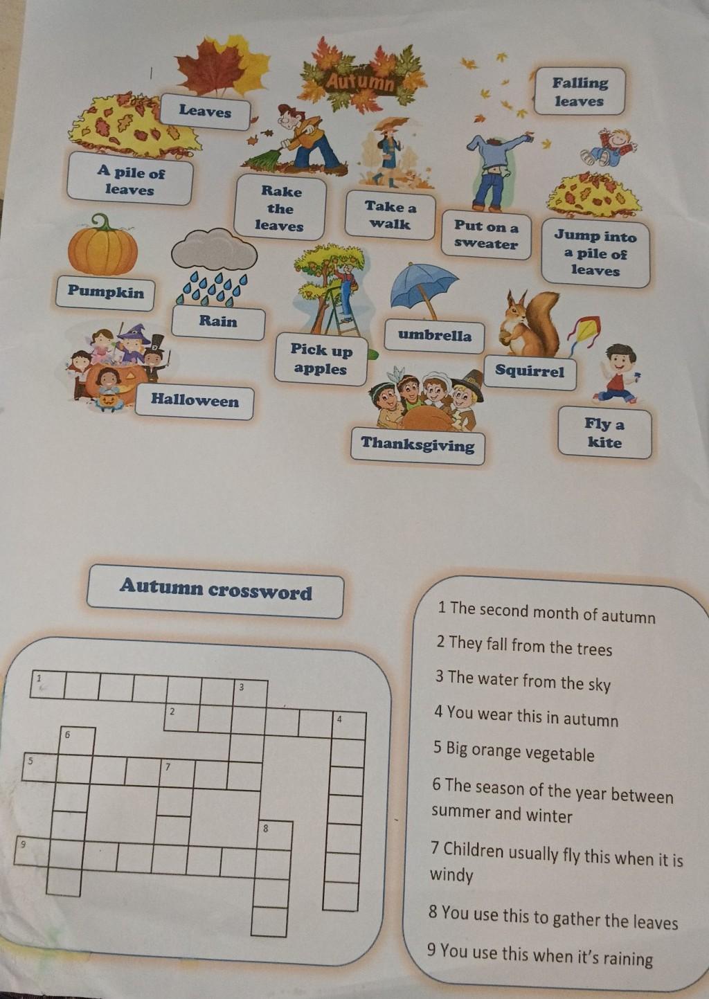 A pile of leaves Pumpkin 9 6 Leaves Rain Rake the leaves Halloween Autumn 2 7 Take a walk Autumn crossword Pick up apples 8 Put on a sweater umbrella Thanksgiving A Falling leaves Jump into a pile of leaves Squirrel Fly a kite 1 The second month of autumn 2 They fall from the trees 3 The water from the sky 4 You wear this in autumn 5 Big orange vegetable 6 The season of the year between summer and winter 7 Children usually fly this when it is windy 8 You use this to gather the leaves 9 You use this when it's raining пж помагите тест у меня