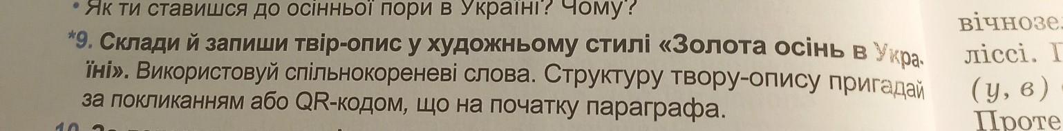 Ось і минуло тепле літо. Настала осінь. Непомітно підкралась вона до наших садів, полів, гаїв, лісів. Ще в кінці серпня дерева почали вкриватись жовтим листям, а зараз воно вже блищало на сонці, ніби золото. Дерева стояли у багряному, жовтому листі, яке потихеньку спадало додолу. Земля була вкрита кольоровим листям, наче йдеш по прекрасному килимі. Я люблю слухати шерехи опалого листя, дивитися на чарівні розписи осені на листях клена. Промайнуло коротке бабине літо, починало повівати холодом, змовкли пернаті музиканти. Ось і прийшов час прощатися із золотою осінню.