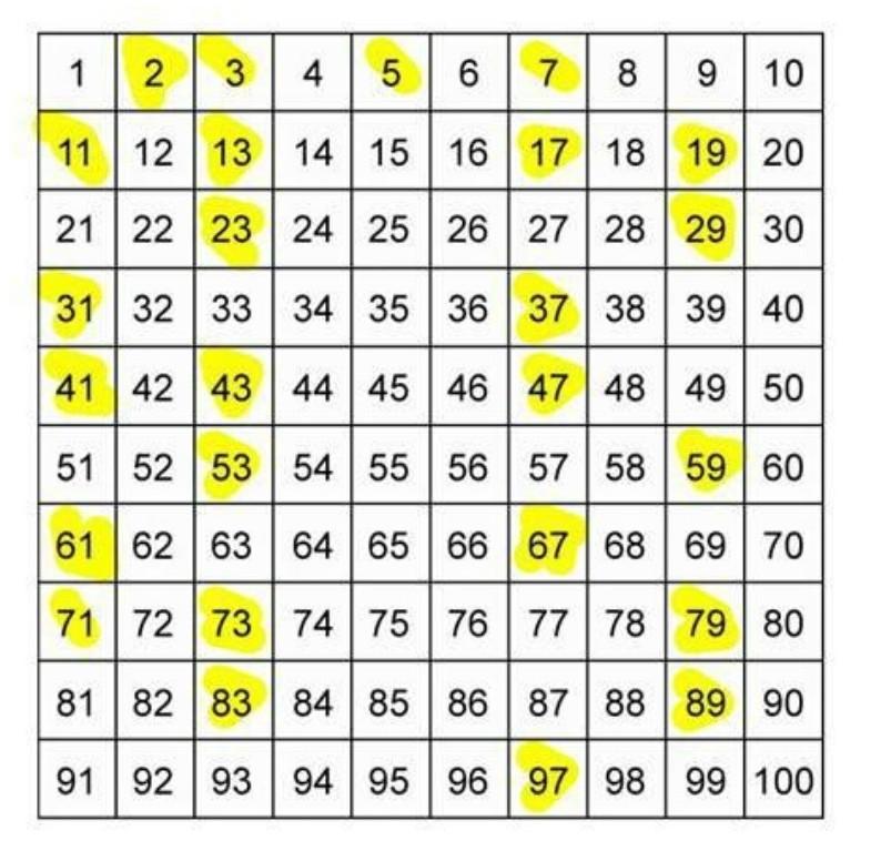 Последовательность простых чисел начинается так: 2, 3, 5, 7, 11, 13, 17, 19, 23, 29, 31, 37, 41, 43, 47, 53, 59, 61, 67, 71, 73, 79, 83, 89, 97, 101, 103, 107, 109, 113, 127, 131, 137, 139, 149, 151, 157, 163, 167, 173, 179, 181, 191, 193, 197, 199,