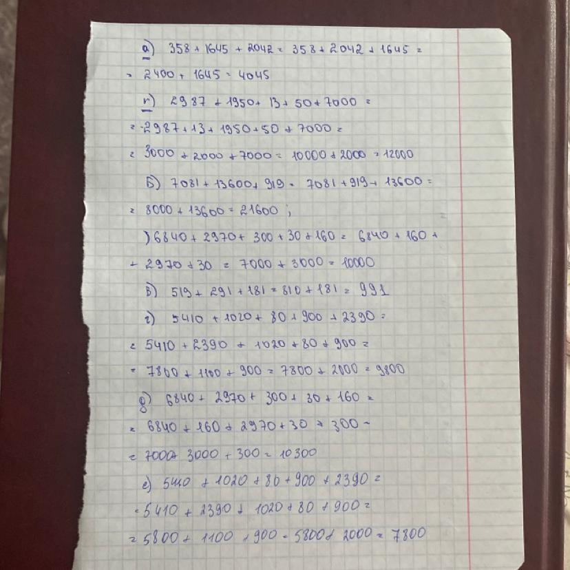 Б) 7081 +13600+ 919; ) 6840+ 2970 + 300+30 +160;