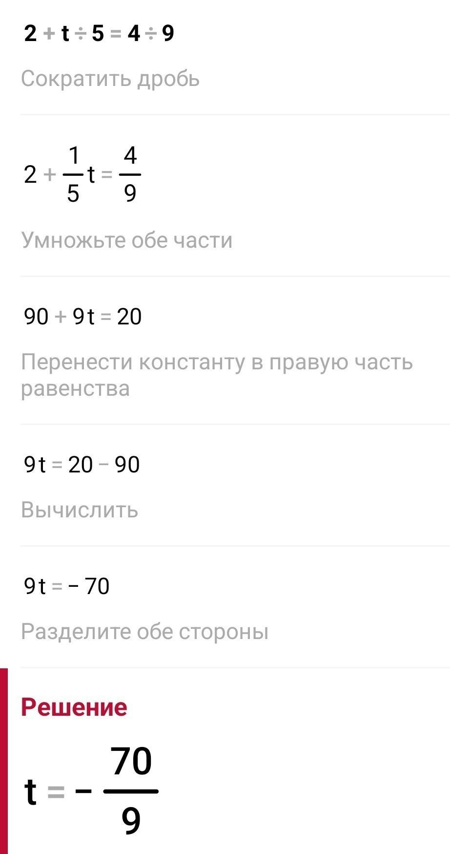 2+t/5=4/9, чи можливо вирішити цю пропорцію? адже якщо 5×4:9=2,(2). вчителька задала на уроці, а відповідь знайти ніде не можу. буду вдячна якщо отримаю відповідь :>