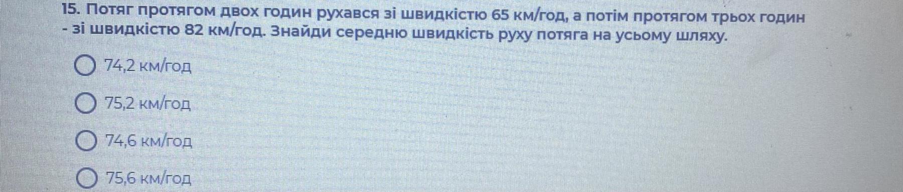 Отже, середня швидкість руху потяга на усьому шляху становить приблизно 75.2 км/год.
