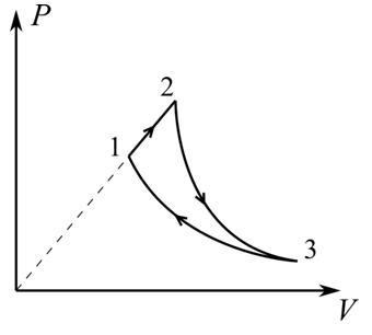 Два моля одноатомного газа совершает цикл. 1-2-3. состоящий из участка, на котором давление прямо пропорционально объему адиабатического расширения и изотермического сжатия. В изотермическом процессе над газом совершена работа 570 Дж. КПД цикла η = 15%. Найти разность максимальной и минимальной температур в адиабатическом процессе. Ответ выразить в Кельвинах с округлением до целого числа.