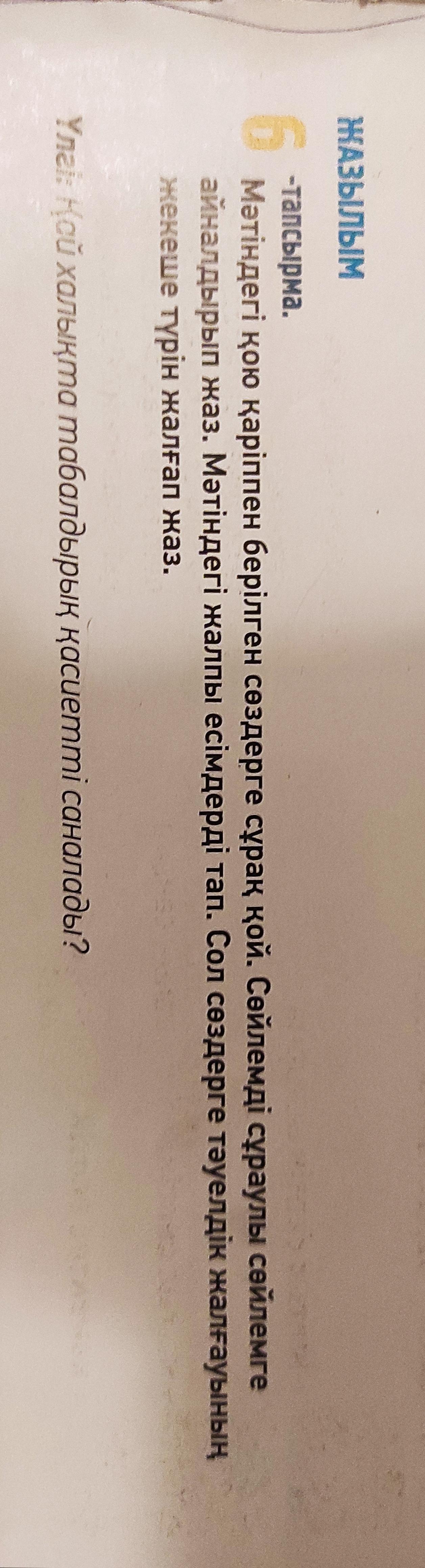 Мәтіндегі қою қаріппен берілген сөздерге сұрақ қой.Сөйлемді сұраулы сөйлемге айналдырып жаз. Мәтіндегі жалпы есімдерді тап. Сол сөздерге тәуелдік жалғауының жекеше түрін жалғап жаз.