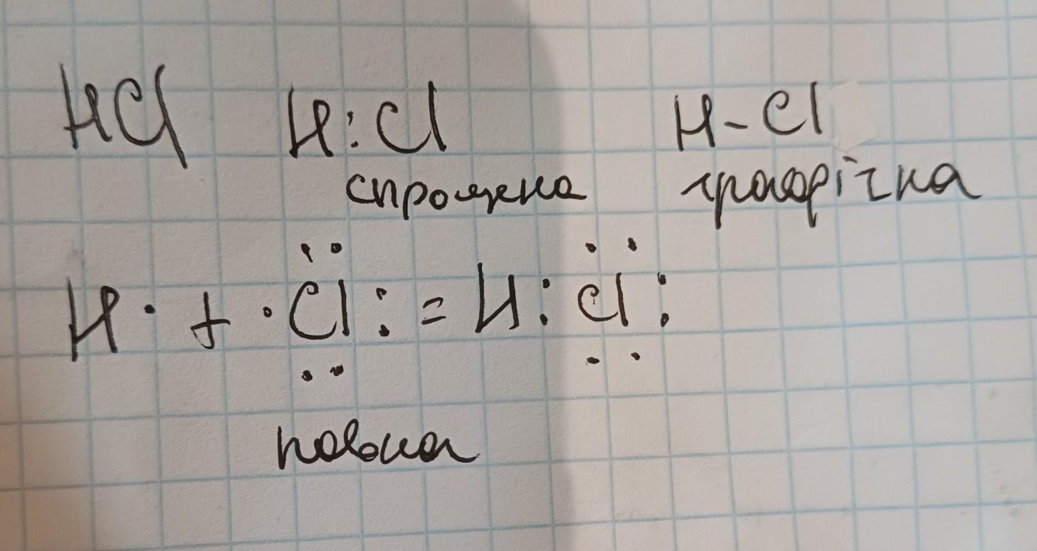 Охарактеризуйте хiмiчний зв'язок у молекулі хлороводню. Складіть схеми утворення цієї молекули з атомів Гідрогену та Хлору, використавши спрощенi та повні електронні формули частинок.