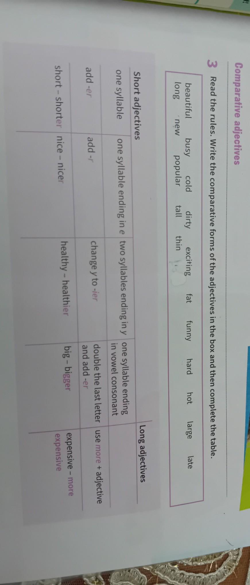Comparative adjectives 3 Read the rules. Write the comparative forms of the adjectives in the box and then complete the table. beautiful busy cold dirty exciting fat funny hard long popular tall thin