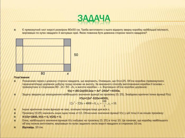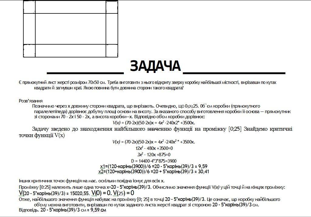Дано прямокутний лист жерсті розміром 70 х 50 см. Треба виготовити з нього відкриту зверху коробку найбільшої місткості, вирізавши по кутах квадрати і загнувши краї. Якою повинна бути довжина сторони такого квадрата?