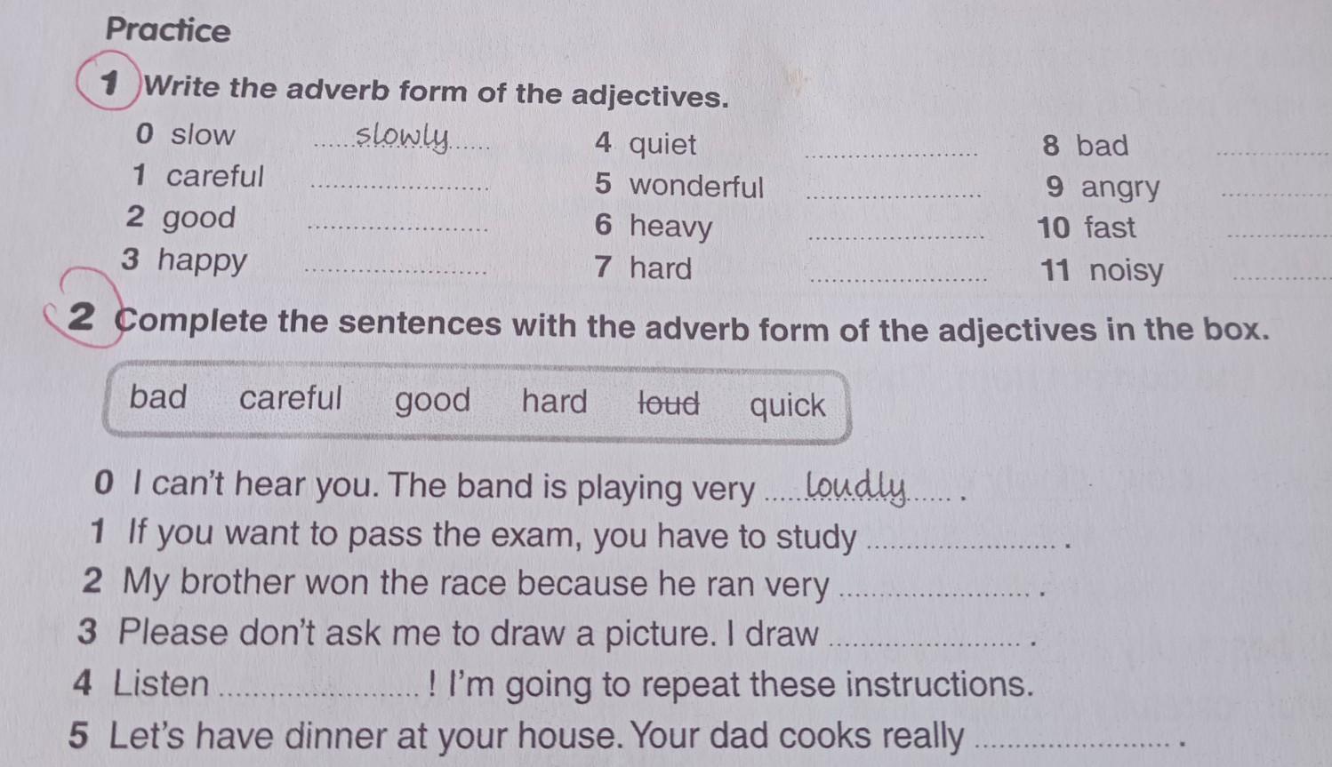 Practice 1 Write the adverb form of the adjectives. slowly 4 quiet 5 wonderful 6 heavy 7 hard 0 slow 1 careful 2 good 3 happy 8 bad 9 angry 10 fast 11 noisy